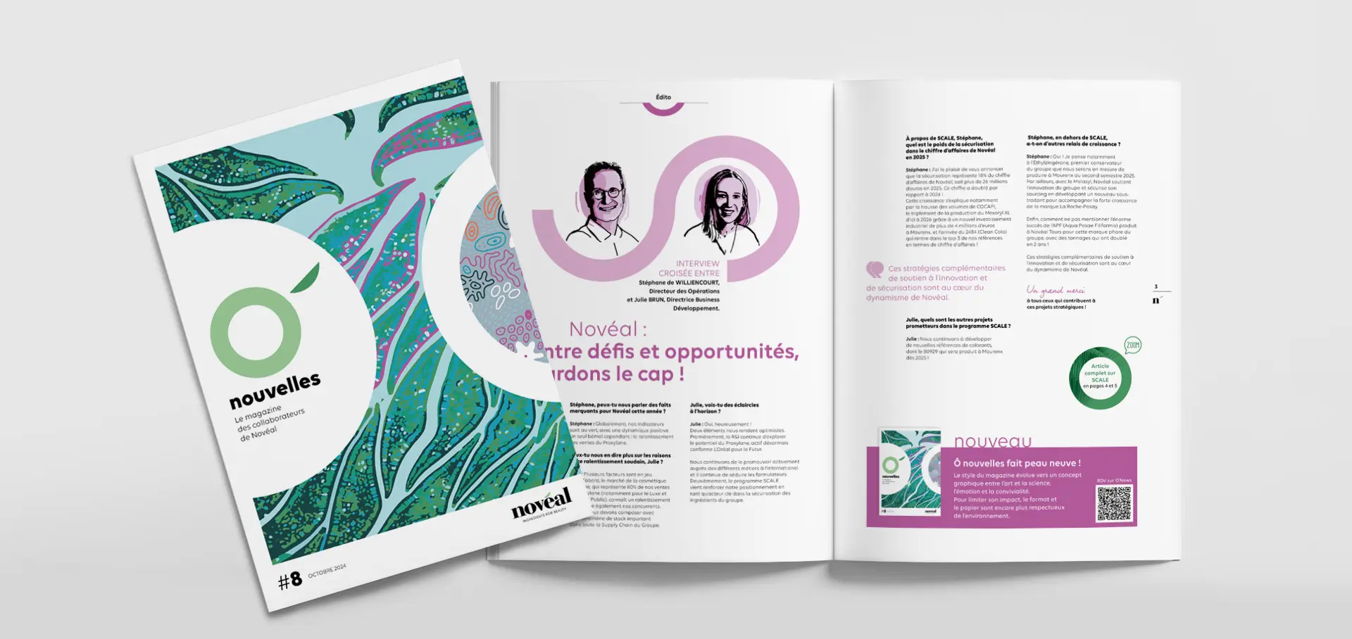 🎉 Nouvelle publication du magazine O’Nouvelles pour NOVÉAL-L’Oréal Groupe. Quel plaisir d’avoir participé à la refonte de ce support unique, un concept créatif entre le magazine et le book au format innovant qui reflète à merveille les engagements, les actions et les valeurs de NOVÉAL-L’Oréal Groupe. Ce design repose sur le juste équilibre entre raison et émotion, incarné par une harmonie subtile entre sobriété et diversité visuelle.