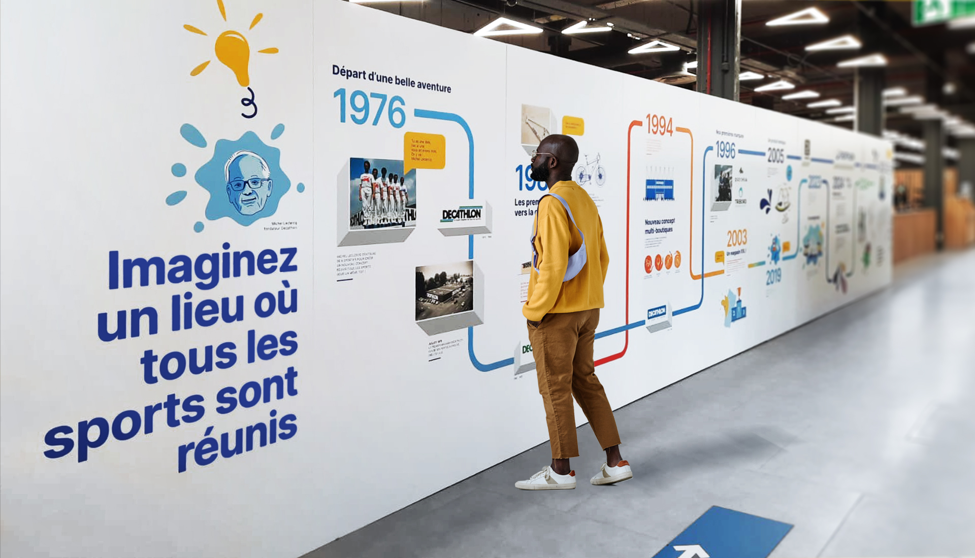 Comment raconter l’histoire de Decathlon et de l’un de ses magasins dans un espace dédié, lieu de passage du grand public ? Coulisses sur la création d’une frise immersive avec double lecture.
