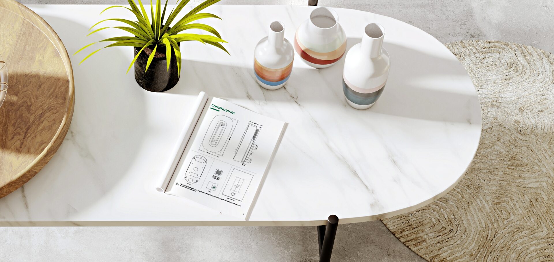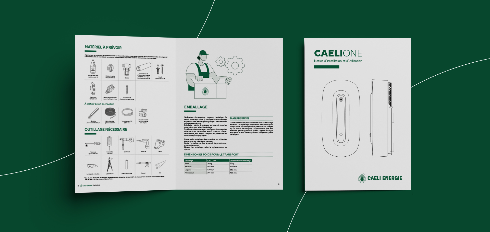 Caeli Énergie nous a confié la réalisation d’une notice d’installation et d’utilisation pour Caeli One, sa solution de climatisation adiabatique. L’objectif : un document de 28 pages capable d’expliquer chaque étape d’installation en un clin d’œil, tout en restant fidèle à l’engagement écologique de la marque.